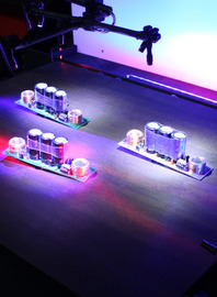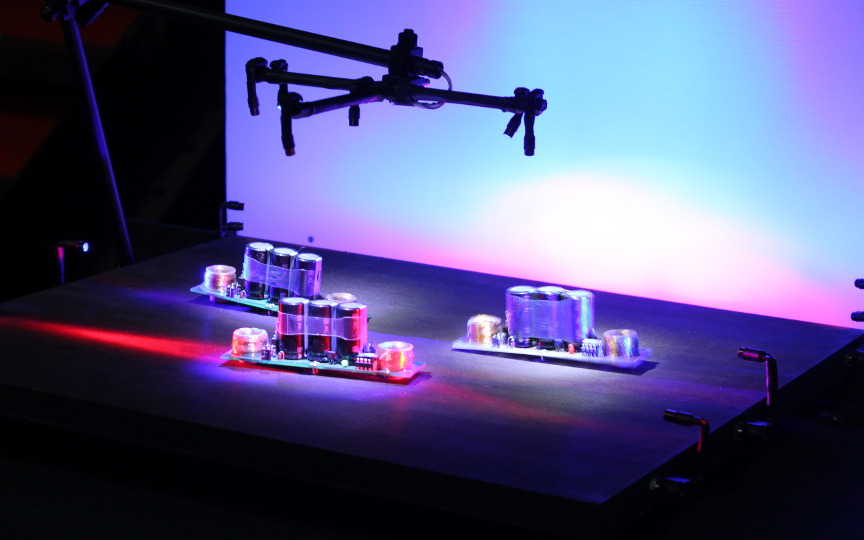 Three tiny robots that dance and play a flamenco performance on a stage especially designed for the flamenco robots.